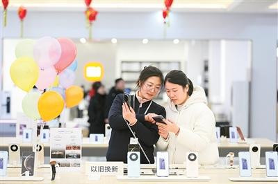 新年伊始,四川省乐山市积极推进消费品“以旧换新”活动,消费市场活力持续释放。图为乐山市市中区一家大型商业购物中心里,消费者在挑选手机。李华时摄(人民视觉)